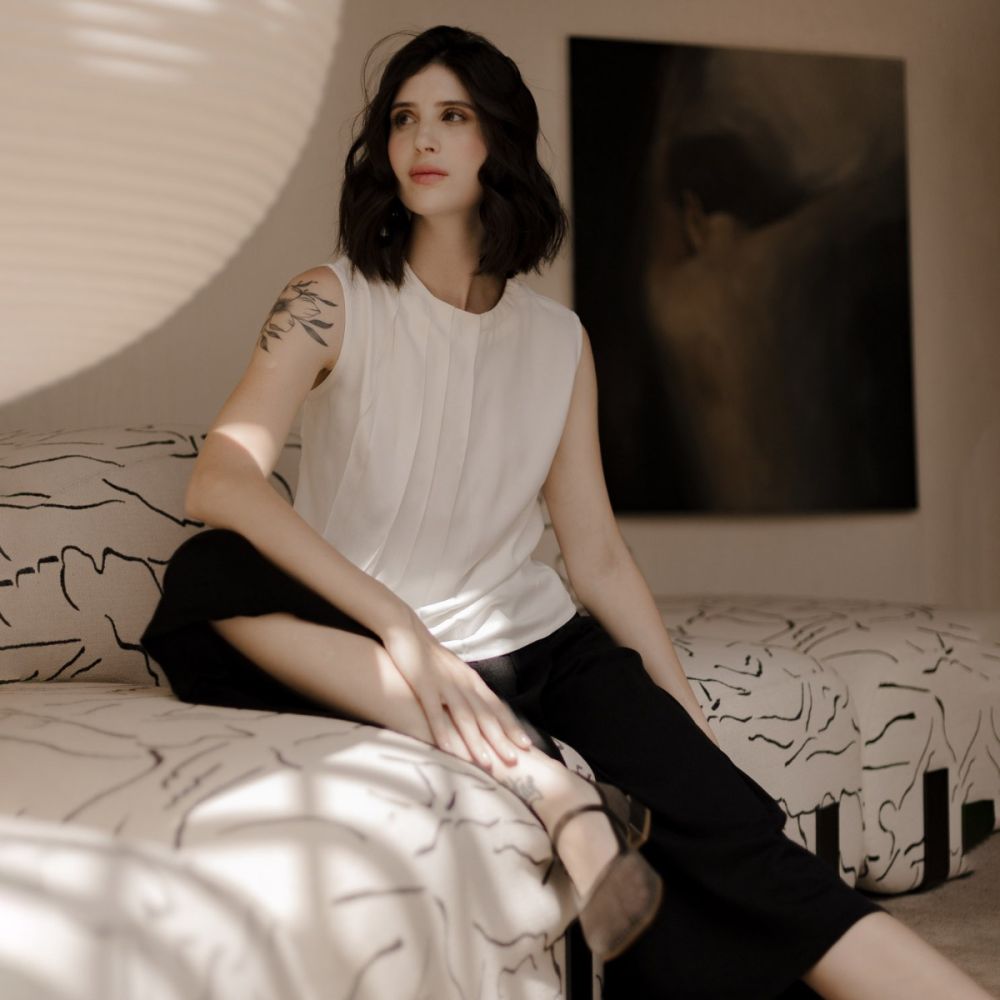 Blusa sem manga com gola franzida e detalhe assimétrico de pregas no sentido vertical (apenas em um dos lados). Confeccionada em um tecido leve e fresco de viscose e modal. Possui fechamento nas costas em botões, que acompanham todo o comprimento da peça. Uma blusa confortável e cheia de bossa que vai lhe acompanhar em todas as ocasiões. A modelo da foto mede 1,74 m e está usando blusa tamanho 36.