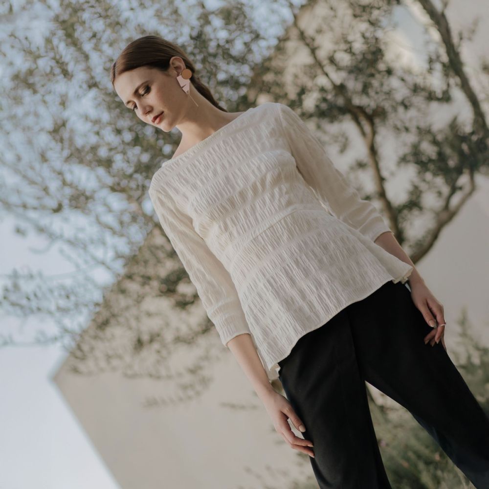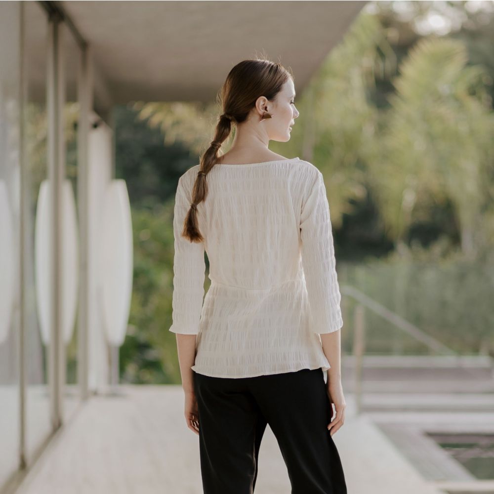 Uma peça básica perfeita para compor looks estilosos, a blusa com peplum é feminina, minimalista e atemporal. Possui manguas ¾ e cintura marcada. Seu tecido é uma anarruga de algodão que possui uma linda textura. uma ótima opção para ser combinada com peças mais sequinhas como calças skinny ou retas e saias lápis. A modelo mede 1,76mts e veste 36.