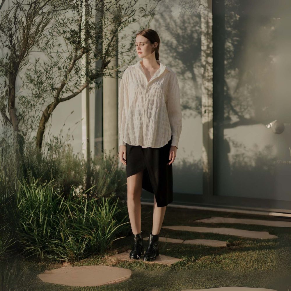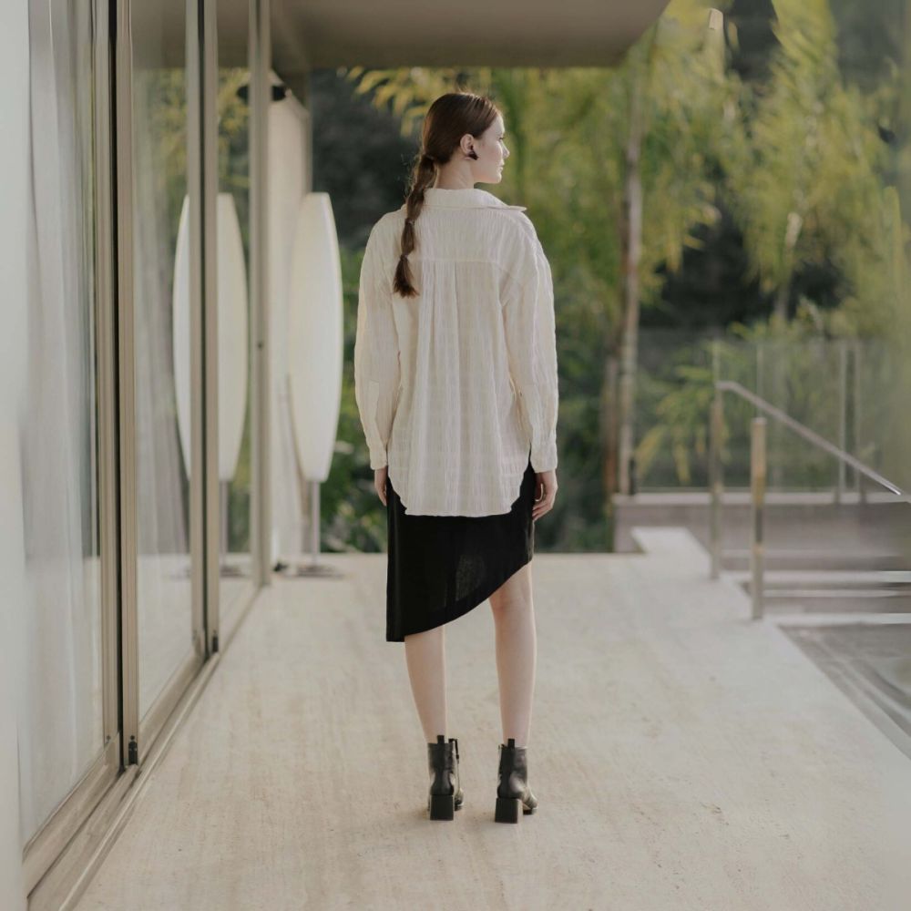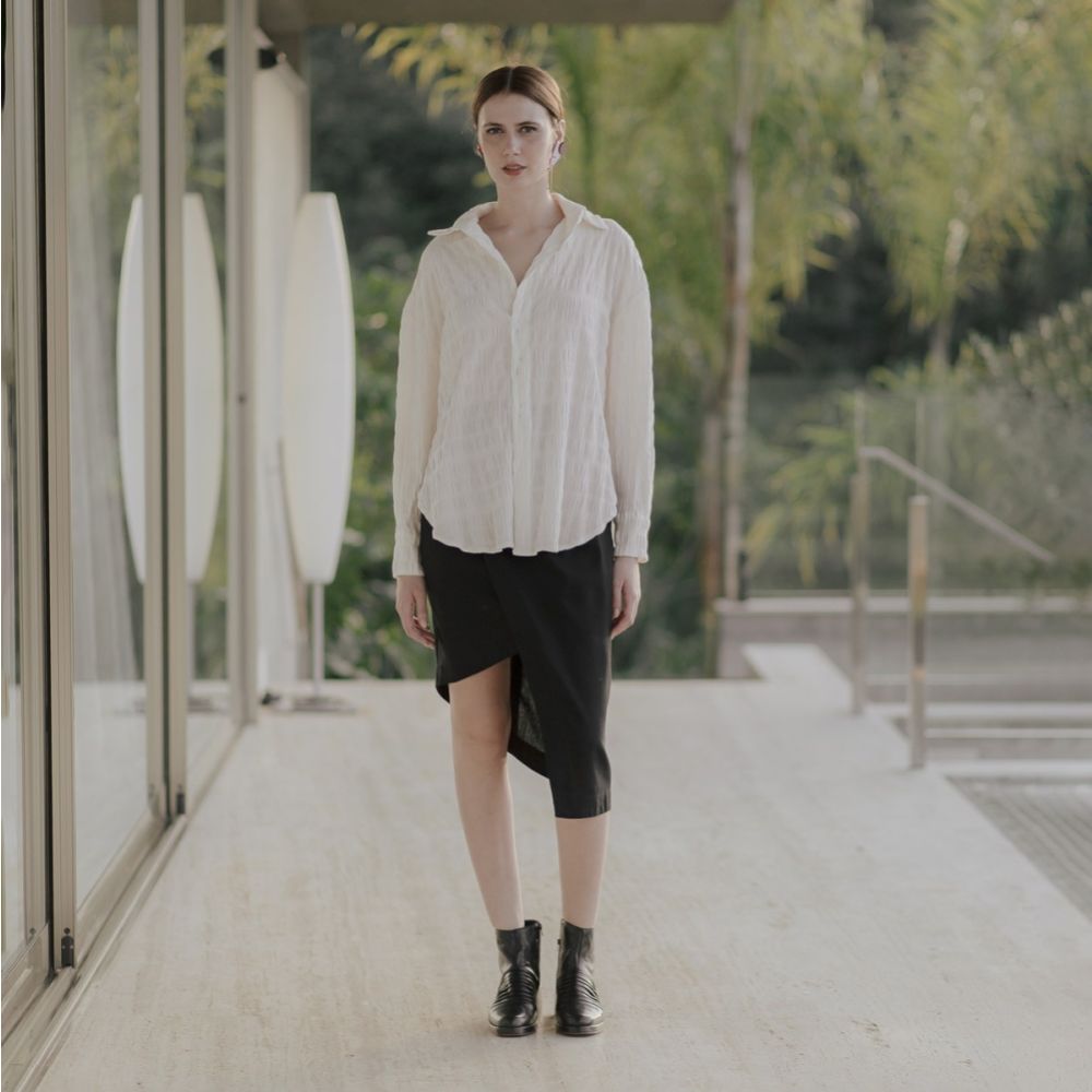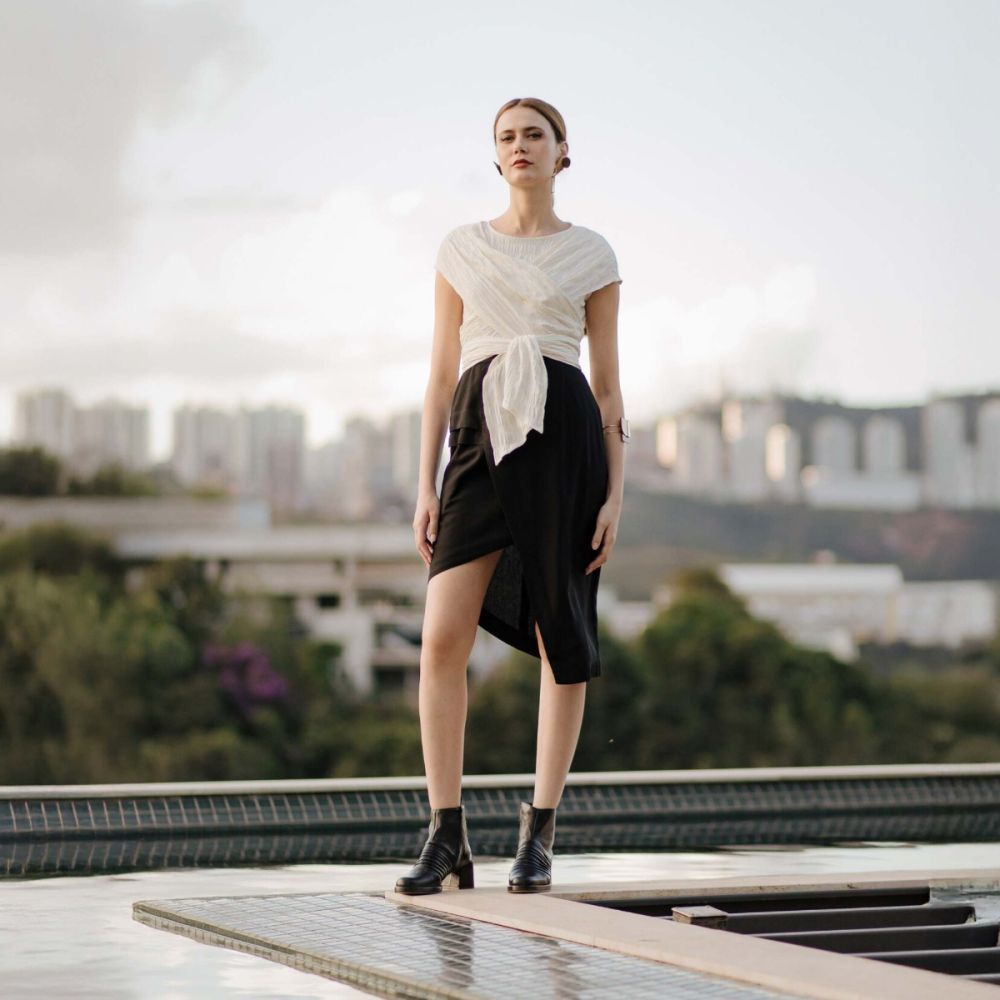 A saia lápis com corte assimétrico, em linho, é um clássico da marca. Veste muito bem, tendo como destaque uma modelagem diferenciada com sobreposições geométricas e assimetria no comprimento. Possui cintura alta e fechamento com zíper no meio das costas. Seguindo a linguagem minimalista e versátil das peças da JARDIN, é uma saia que compõe looks diversos: tanto mais formais, quanto modernos e despojados, podendo até compor looks mais sensuais, sem vulgaridade, com uma mudança na blusa ou sapato! Ou seja, aquela saia coringa que foge do básico e traz um UP nas suas produções. A modelo tem 1,76 mts e veste 36.