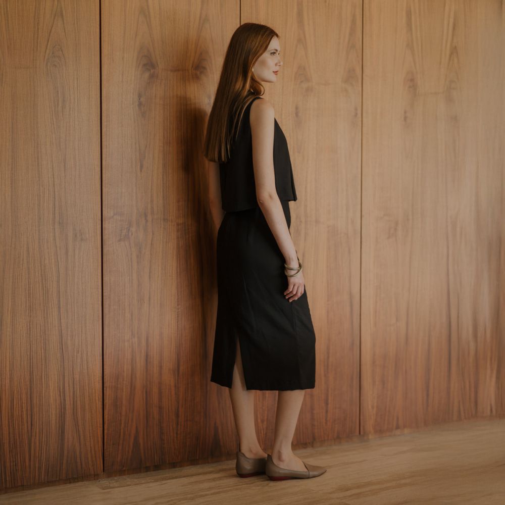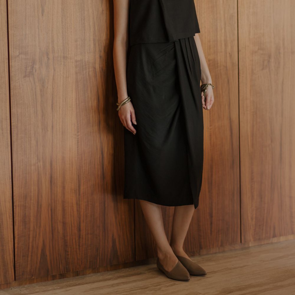 Um clássico nada óbvio é a saia midi drapeada assimétrica – feita em tecido de viscose de bamboo. É uma peça atemporal para se ter sempre no armário. O toque leve e fluido do tecido se molda aos movimentos do corpo, que são ressaltados pelas linhas pregas que caem na diagonal criando um lindo drapeado. Possui uma saia mais curta na parte interna e uma abertura que traz sensualidade na medida certa. Na cor preta, é uma opção para looks modernos e elegantes. Composição: 80% Viscose 20% Poliamida. A modelo mede 1,76 mt e veste tamanho 36.