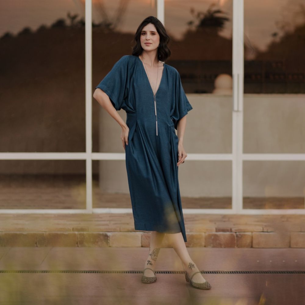 Vestido amplo com manga morcego e decote V Confeccionada em um sofisticado jacquard de viscose com linda textura em tons azul denim e preto. Possui o comprimento midi e um lindo trabalho de pregas na altura da cintura. Uma peça confortável, descolada, fresca e que lhe deixa bem-vestida para as mais diversas ocasiões. A modelo da foto mede 1,74 m e está usando vestido tamanho P.