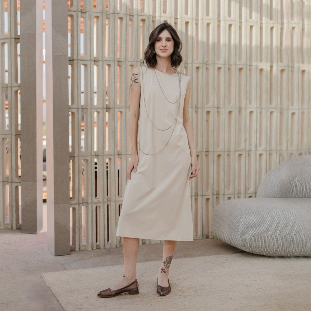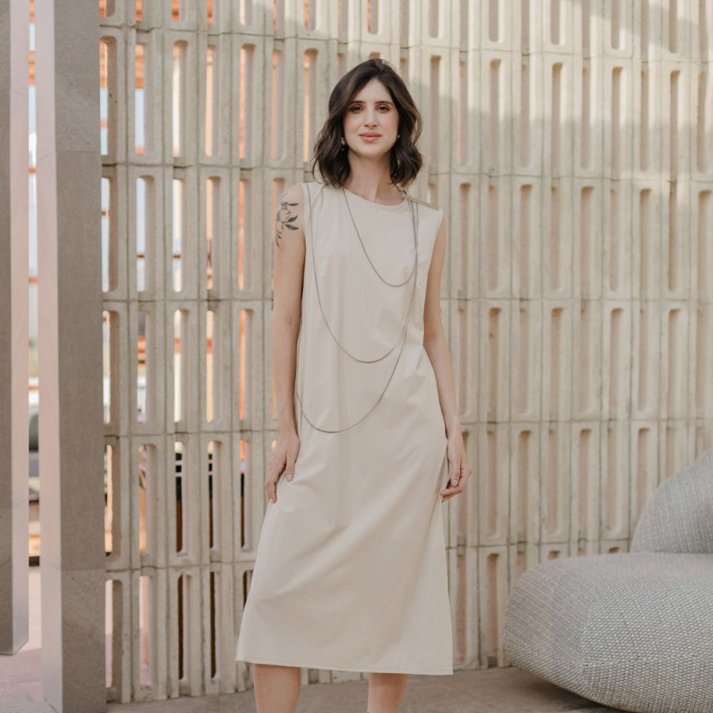 Vestido midi sem mangas com corte mais reto que destaca a silhueta de forma sutil. Possui fendas laterais que trazem um charme extra a peça e que permitem fluidez ao caminhar. Motivados pelo desejo de oferecer praticidade e sofisticação, este item foi confeccionado em tecido tecnológico que mescla poliamida e elastano: material de secagem rápida, que não amassa e que, ao mesmo tempo, mantem o frescor e permite a transpiração da pele. Uma peça minimalista e chic, versátil para as mais diversas ocasiões! A modelo da foto mede 1,74 m e está usando vestido tamanho P